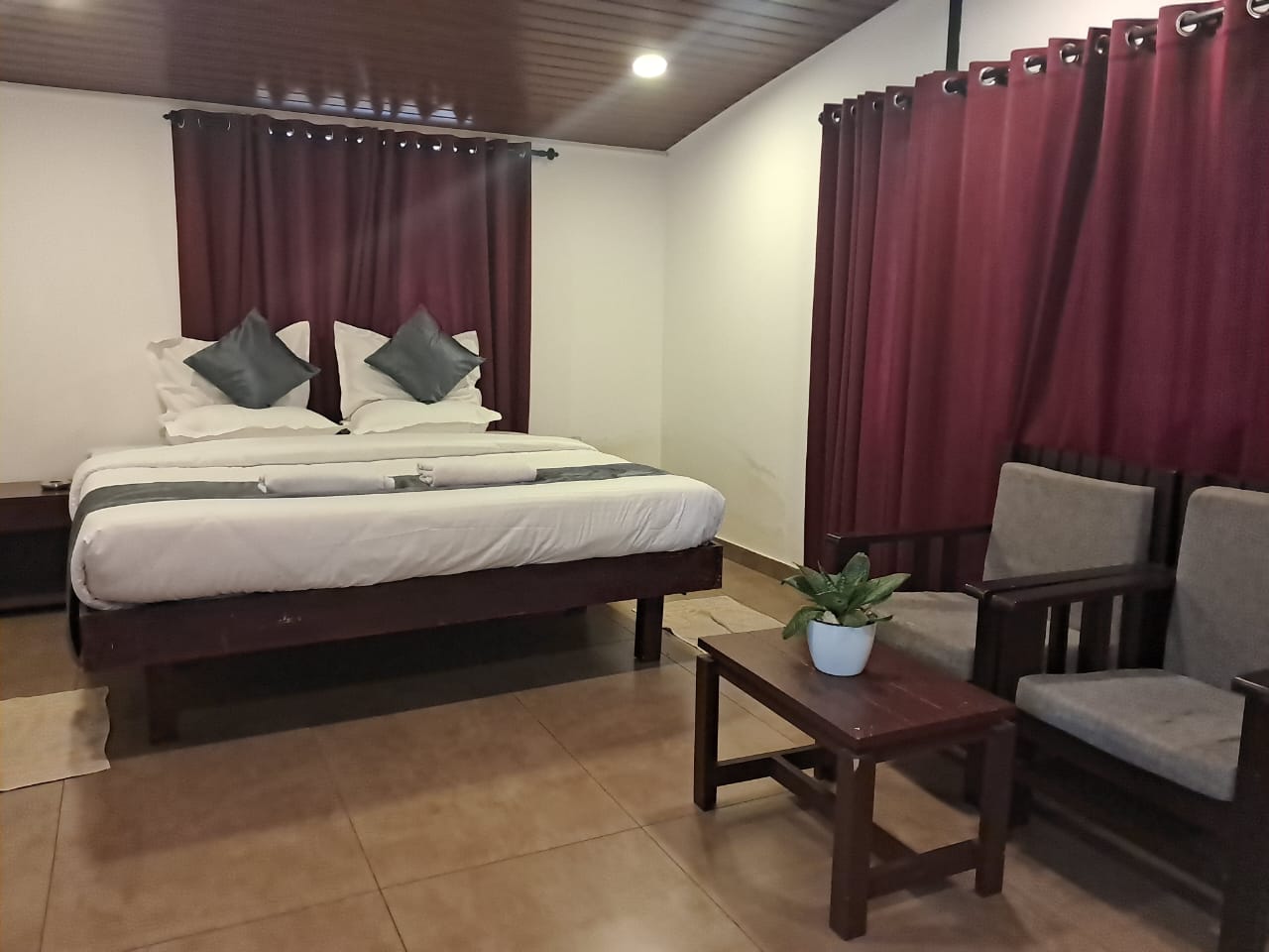 All cottages furnished with contemporary modern style of luxuries resort and rooms are tastefully furnished with wooden décor and works of art. Each has a comfortable bed room ,an attached bath with geyser and a spacious lounge .Each bedroom had a king sized bed ,a wardrobe and a dressing table .The lounge has a dining area with two chairs and a couch .The rooms and cottages are situated around one acre coffee plantation .
